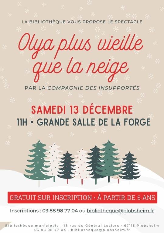 La bibliothèque a le plaisir de vous inviter au spectacle Olya plus vieille que la neige, par la Compagnie des Insupportés, samedi 13 décembre à 11h dans la salle de La Forge.