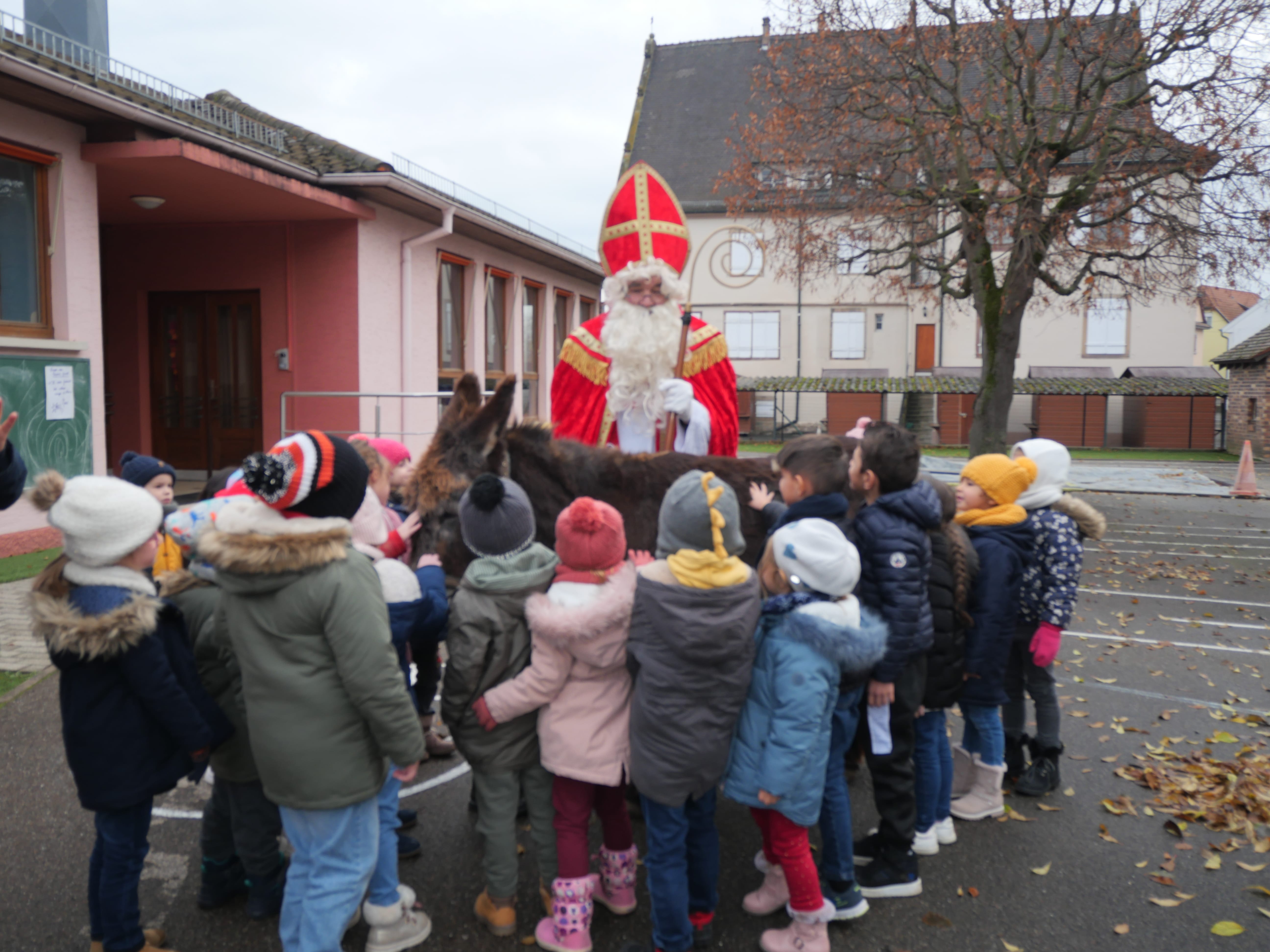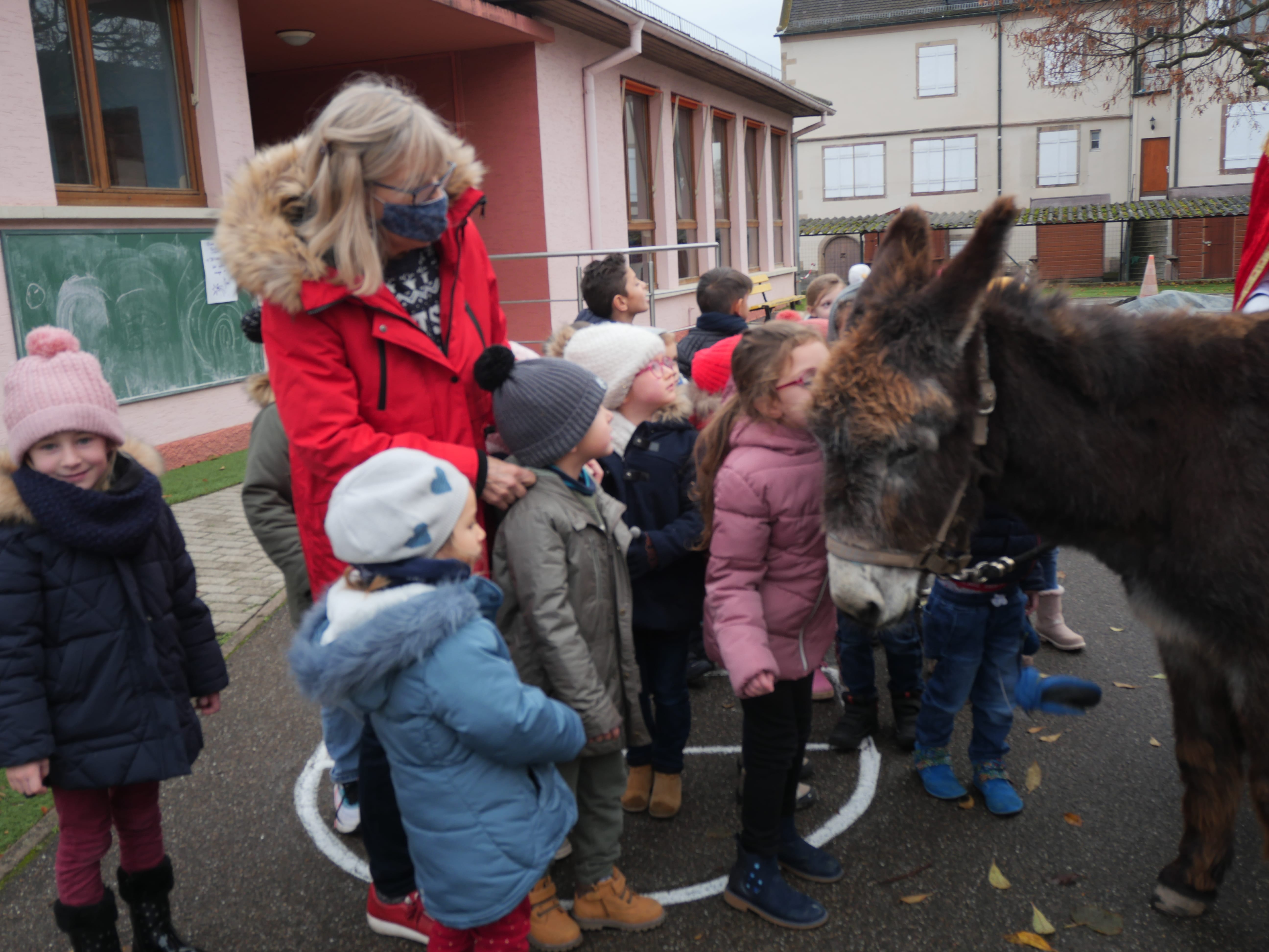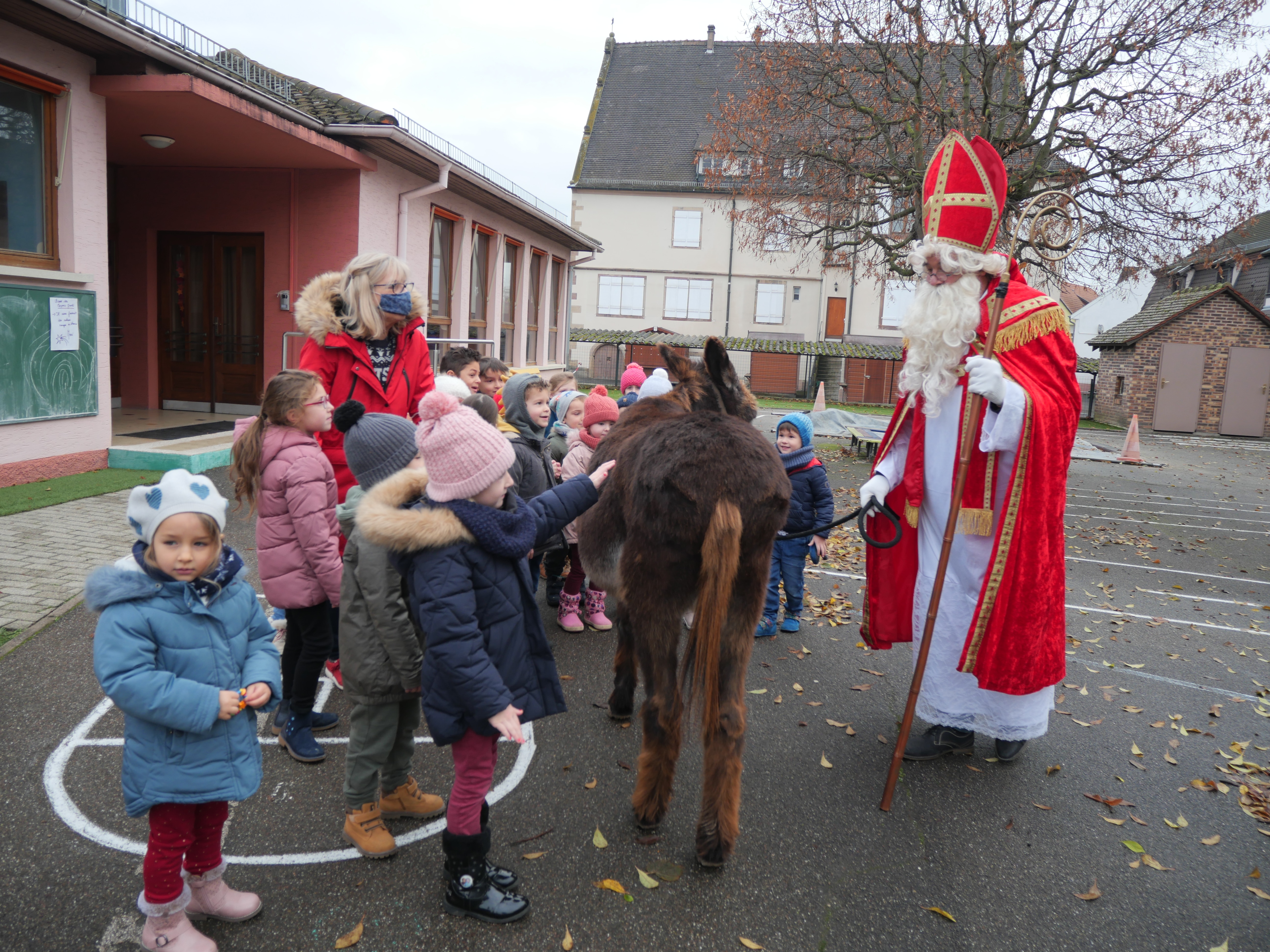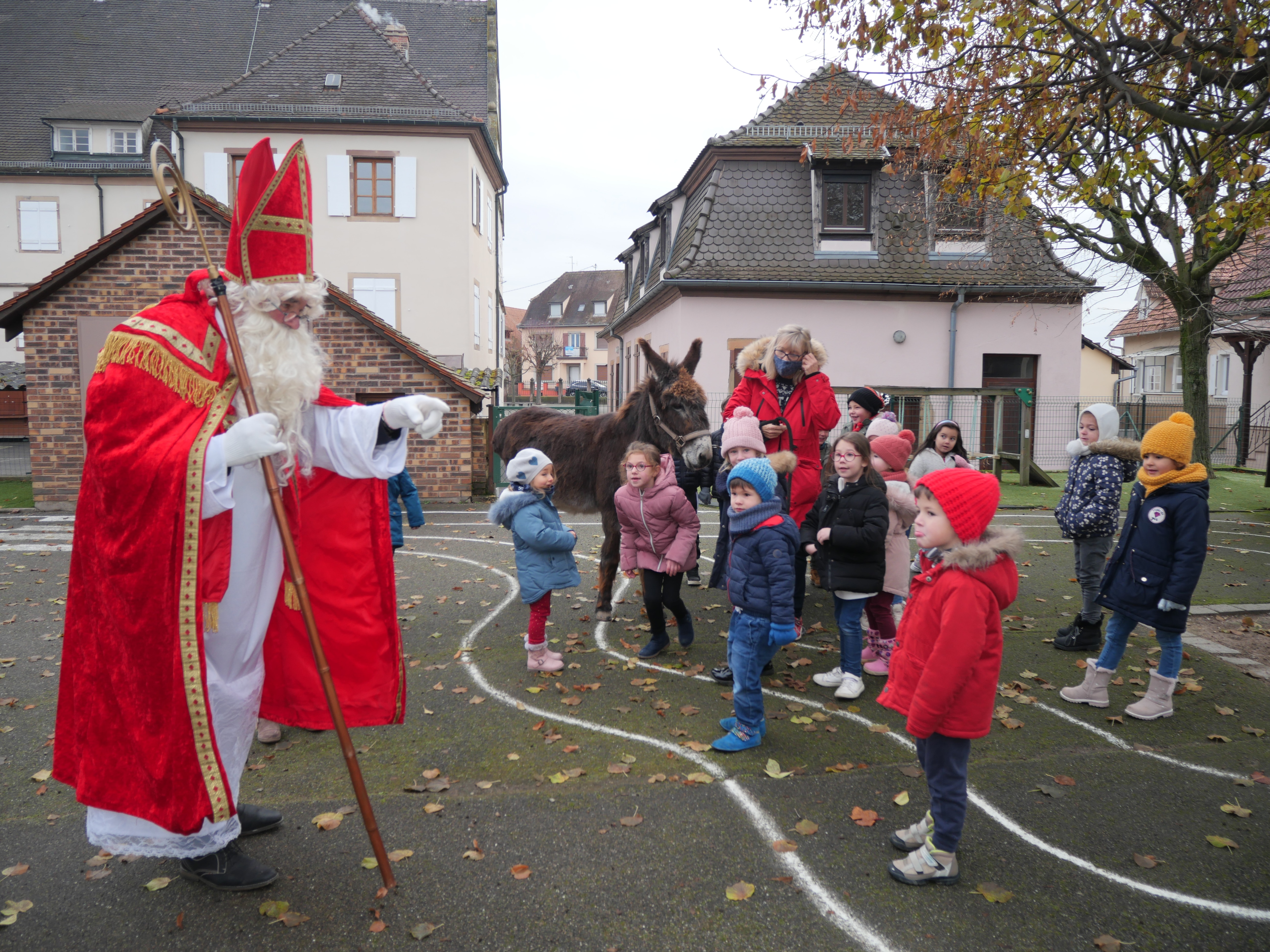 Saint-Nicolas a fait sa tournée à Plobsheim accompagné de son âne Paco. Il a fait le bonheur des petits écoliers. Il a débuté sa tournée à l’école du Moulin puis au groupe scolaire Au fil de l’eau où il a été accueilli par tous les enfants de l’école dans la cour. Chaque classe a chanté une chanson en son honneur. Les enfants ont donné des carottes à Paco, le fidèle comparse de Saint-Nicolas.  Ensuite, le cortège est arrivé à l’école du Centre sous les yeux ébahis des enfants.  Saint-Nicolas est allé dans les deux classes de maternelle pour écouter les chansons préparées par les élèves et découvrir leurs belles créations, notamment le portrait du Saint-Nicolas que les écoliers ont peint pour l’occasion.